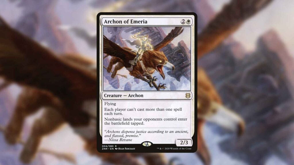 Archon of Emeria is not for players trying to make friends. As a Rule of Law on a stick, this card already shuts down a lot of Commander strategies on its own. Forcing your opponent’s nonbasic lands to enter tapped is just added insult to injury, slowing the game down to a crawl.