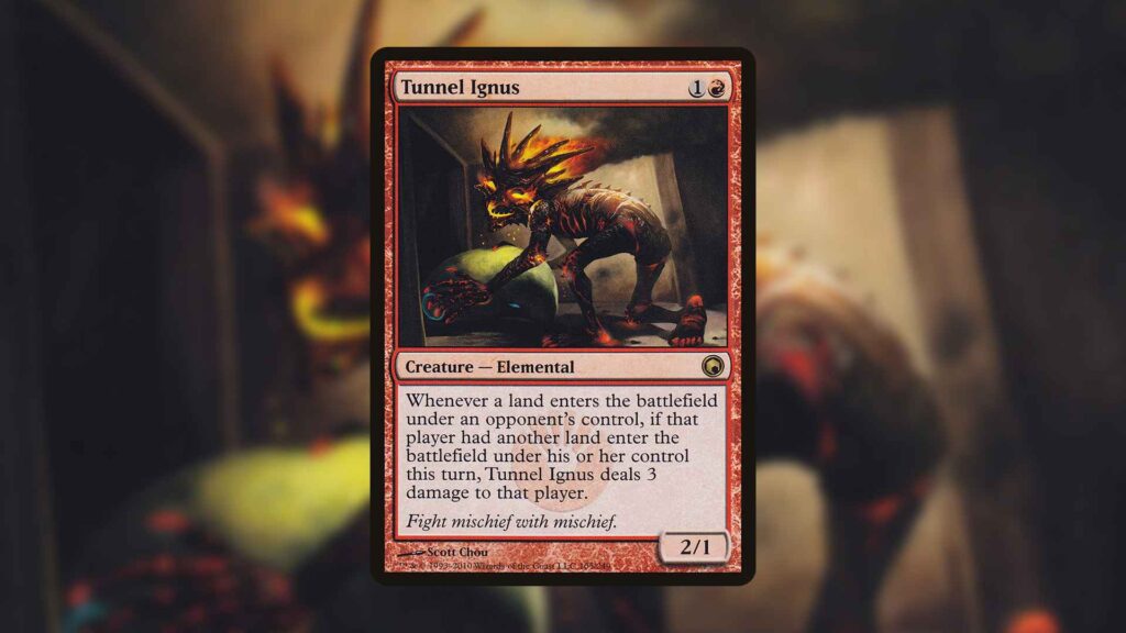 Unlike most hate pieces like this, Tunnel Ignus has the added benefit of being asymmetrical. You’re free to play tons of lands while your opponents take Lightning Bolts to the face for doing the same thing. This can make universal ramp spells like Tempt with Discovery extremely painful.