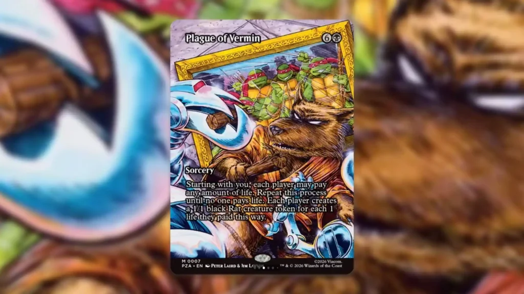 Interestingly, Ashcoat isn’t the only Rat-themed card to receive a first-time reprint in the TMNT bonus sheet. Plague of Vermin is finally receiving a new variant of its own, too. With each player starting at 40 life in Commander, Plague of Vermin has the potential to make a boatload of tokens. With any way to break the symmetry, such as a mass pump effect, this card can easily take over a game.