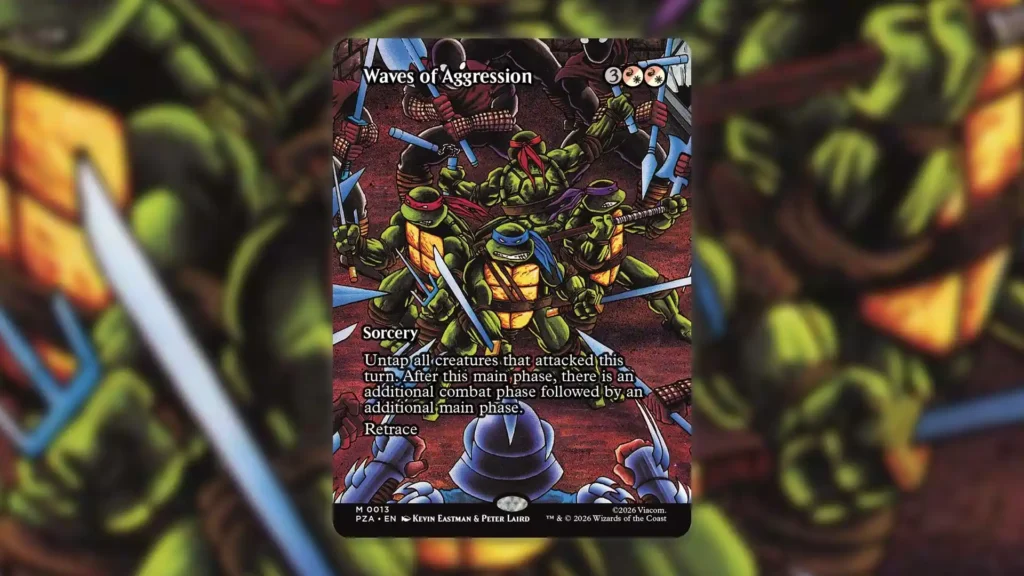 Even without making a big impact in EDH, Waves of Aggression has maintained a hefty price tag largely due to the lack of reprints. This is also the first time this sorcery has received any kind of reprint since debuting in Eventide in 2008. As such, this alternate art, borderless card is a great choice for a reprint.