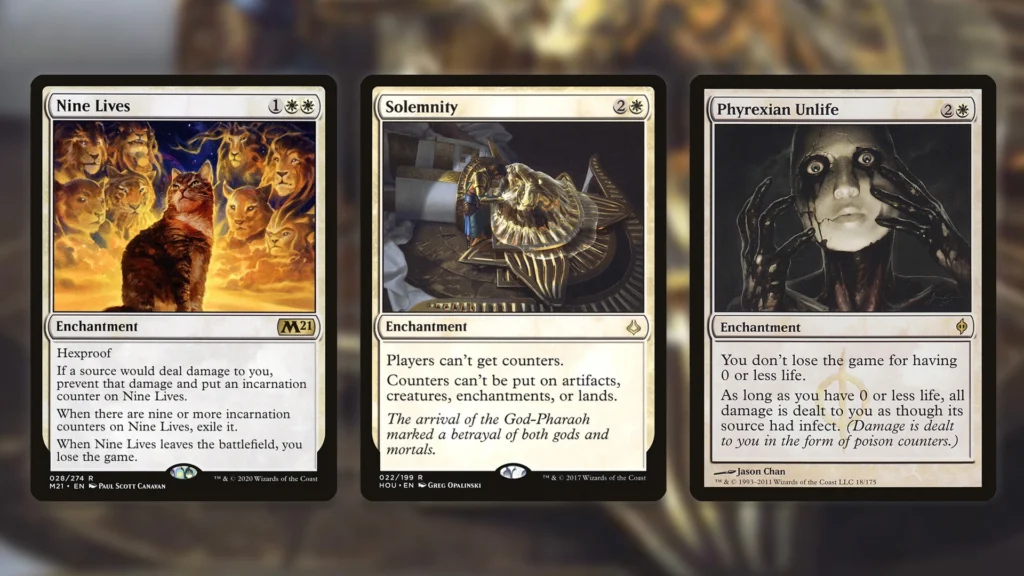 In order to do so, you need to assemble one of two combos both centered around Solemnity. Solemnity ensures that no counters can be put on Nine Lives, so you won’t be taking any damage for as long as these two enchantments stick around. Similarly, if you pair Solemnity with Phyrexian Unlife, you won’t be able to rack up poison counters after your opponent gets you to zero or less life. Phyrexian Unlife even protects you against life drain effects like Blood Artist, which helps a lot in the Golgari Yawgmoth matchup.
