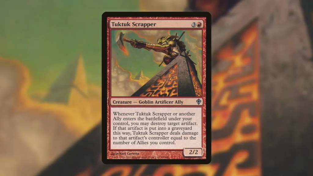 What sets Tuktuk Scrapper apart from a lot of other Ally typal payoffs is that you don’t need to have a big board for it to pull its weight. This creature’s enters ability isn’t restrictive in any way, and while it threatens to deal more damage the more Allies you have in play, the artifact destruction portion alone is great in a format dominated by Sol Ring and other mana rocks.