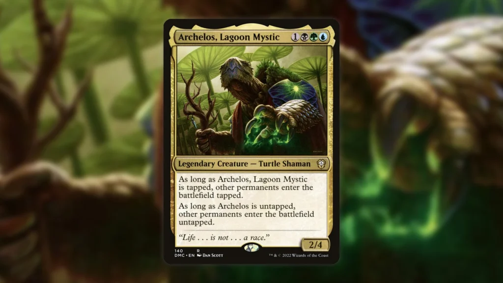 Archelos, Lagoon Mystic might look like a very simple Turtle, but in reality, he can be a real monster. For starters, getting to have all your tapped lands enter untapped, or any permanent for that matter, enables some really sweet synergies. Getting to play any Gates or Bounce Lands with no drawback is already great, but Archelos makes Scapeshift a game-ending threat.