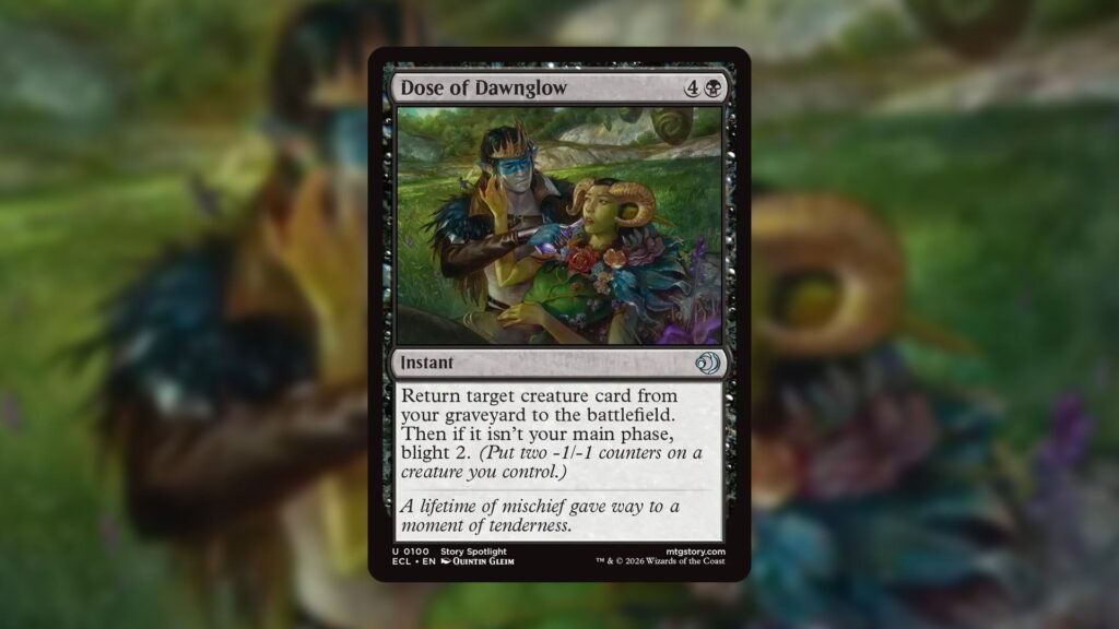 A new mechanic introduced in Lorwyn Eclipsed, Blight asks a player to put a number of -1/-1 counters on a creature they control. Essentially, this means that, if you reanimate a creature at instant speed, you’ll need to give one of your creatures two -1/-1 counters. Because of the way Dose of Dawnglow is worded, you won’t be able to get out of this by having no creatures in play when casting the spell, either, since you can put the counters on the reanimated creature.