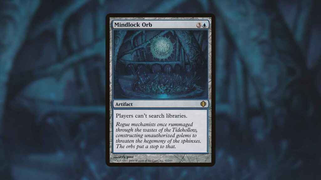 Mindlock Orb has a simple effect that’s far more deadly than it looks at first glance. For starters, the card shuts down problematic tutors like Demonic Tutor and Gamble, which prevents many game changers from running away with the game.