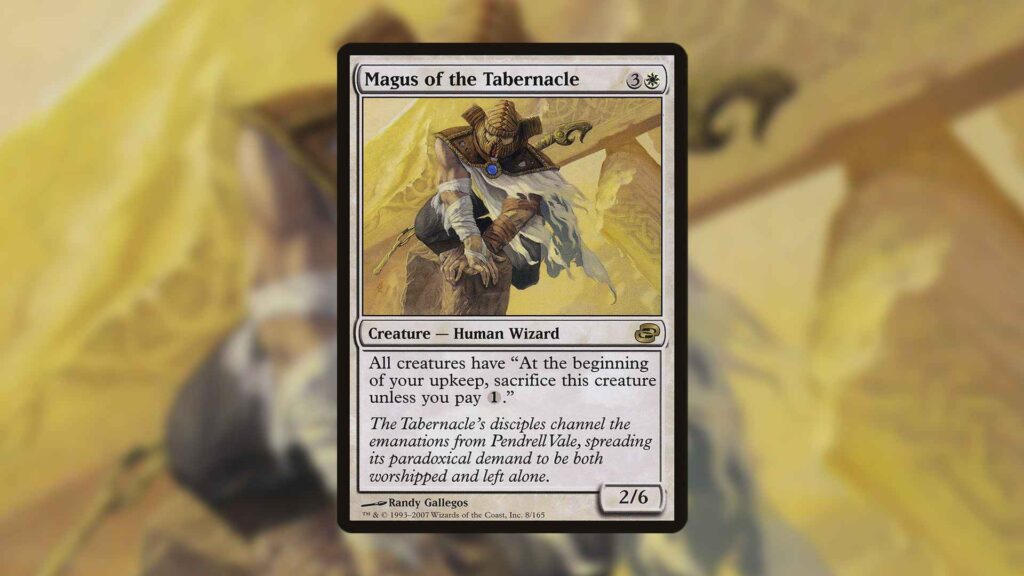 Part of an iconic series of cards that reimagine busted effects on creatures, Magus of the Tabernacle is an absolute nightmare for creature token decks. Since everyone has to pay one mana for each creature they control, it will be impossible for your opponents to go wide. Use this Magus with cards like Mana Short, and you can essentially turn this card into a one-sided board wipe.