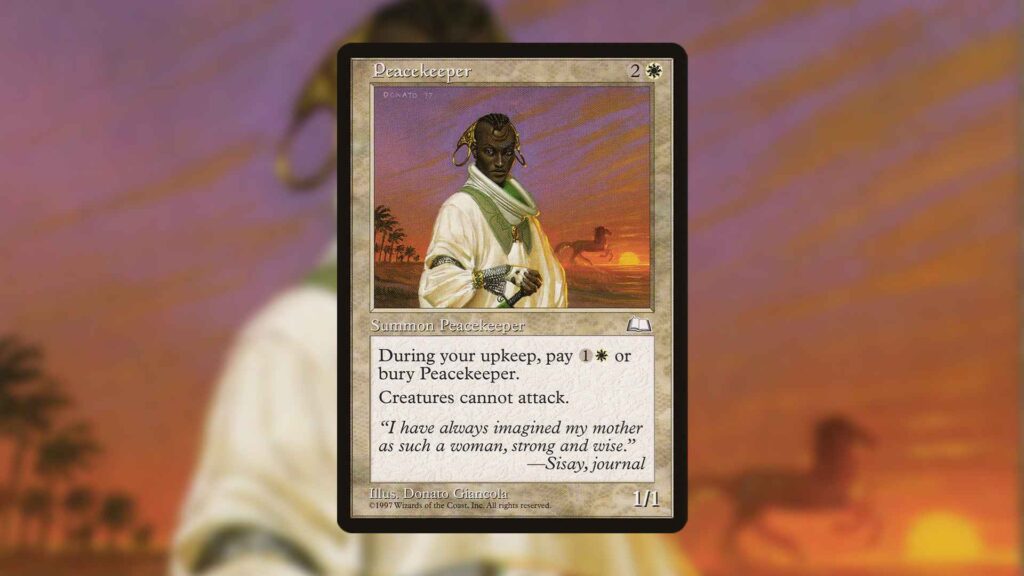 At worst, however, Peacekeeper should buy your passive decks some time while drawing some removal that could have hit your Commander. Considering that, $9 for this Reserved List card seems like a bit of a steal. That could change in the future if Peacekeeper starts to see more play, but, for now, this looks like an incredible addition for all kinds of Commander decks.