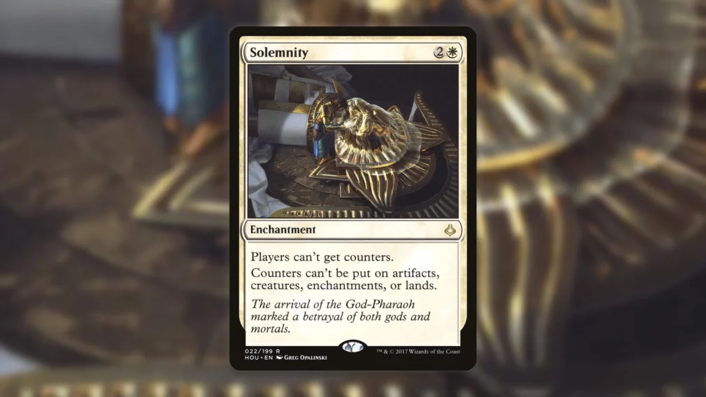 Leaning into the theme of removing Finality Counters, Leonardo, Sewer Samurai can create infinite combos using cards like Solemnity. With Solemnity in play, creatures can be reanimated endlessly, which opens up spicy combo lines using Phyrexian Altar. Any one cost low-power or toughness creature, for instance, can be sacrificed and reanimated endlessly using these two cards.