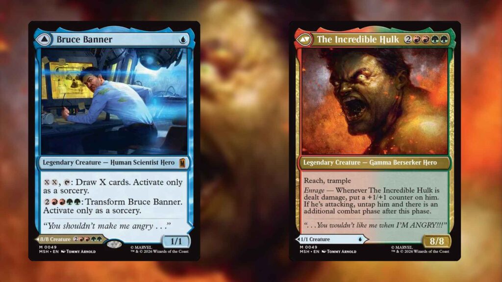 The first MDFC card introduced for Marvel Superheroes, Bruce Banner // The Incredible Hulk offers two cards that contrast in their game plans heavily. Bruce Banner can get on board quickly and draw a ton of cards over the course of the game, while The Incredible Hulk just wants to, well, smash.