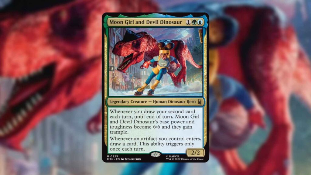 The duo notably only cares about artifacts you control entering, which means artifact tokens, like Clues and Treasures, are fair game. Despite the once-per-turn restriction, you can also trigger Moon Girl and Devil Dinosaur multiple times per turn rotation, drawing four extra cards per rotation in an average Commander game.