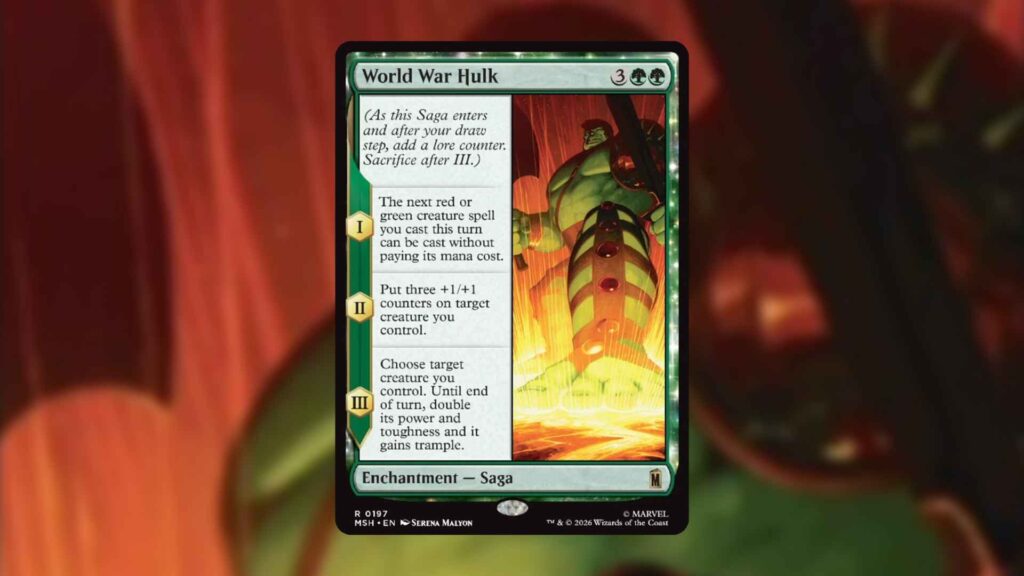 World War Hulk, frankly, might be a problem. Cheating in any red or green creature for five mana is already exciting, but this Saga gives you even more value past that. Even if your cheated in creature dies, the second mode of this card turns any creature into a threat, and the third mode can cause a massive knockout punch from even a mana dork.