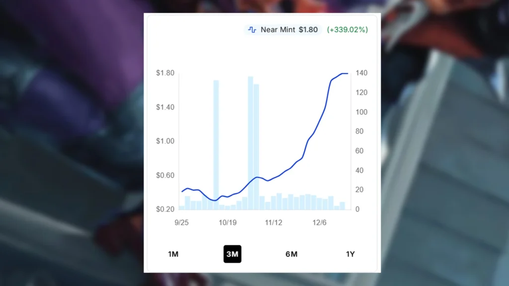 Fire Lord Azula was officially revealed back on October 28, and demand begun to skyrocket just a couple days later. Arcane Heist’s price point began gradually climbing soon after, and it’s been steadily rising for the most part ever since. The cheapest current sales listing is $2.53, which represents a 716% price spike since Arcane Heist’s lowest point. This doesn’t even include shipping fees, which raise each individual purchase even higher.