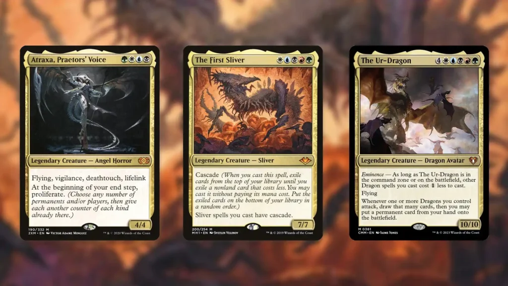 In this bracket, you can expect to find many of the strongest themes and typal archetypes Commander has to offer. Slivers, Dragons, Elves, and Superfriends are all elite options that can snowball out of control. For this reason, The First Sliver, The Ur-Dragon, Voja, Jaws of the Conclave, and Atraxa, Praetors’ Voice are some of the best MTG Commander decks in bracket four.