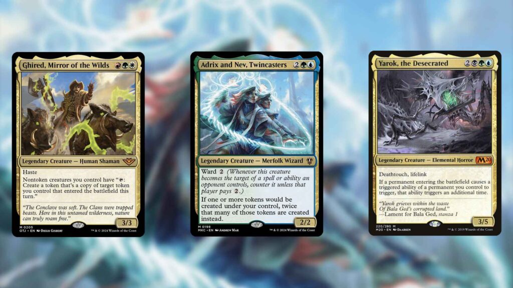 While there are a lot of ways to do cool things with Bramble Sovereign, the best Commanders for the Dryad directly amplify the efficiency of its triggered ability. Effects that improve Bramble Sovereign’s token capabilities, for example, can easily use the Dryad to snowball the game in your favor. Trostani, Selesnya’s Voice and Adrix and Nev, Twincasters are two powerful examples of this. Trostani can store a lot of life from Sovereign’s triggers before Populating the tokens it makes, while Adrix and Nev is a Parallel Lives on a stick, copying any token created under your control. In a similar vein, Ghired, Mirror of the Wilds can use its own abilities to create more copies of the tokens that Bramble Sovereign starts, creating a massive exponential amount of value.
