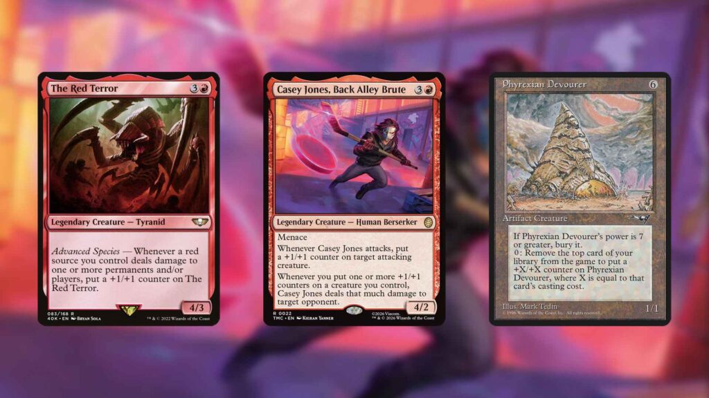 Thanks to turning acquired +1/+1 counters into damage, Casey Jones creates multiple two-card infinite combos, even when in the Command Zone. Alongside The Red Terror, for instance, it and Casey Jones create a feedback loop, triggering off one another, to give you infinite counters and damage. Phyrexian Devourer, on the other hand, isn’t quite infinite, but unless an opponent has hundreds of life, the sheer number of +1/+1 counters Devourer gains should allow Casey Jones to knock out most opponents.