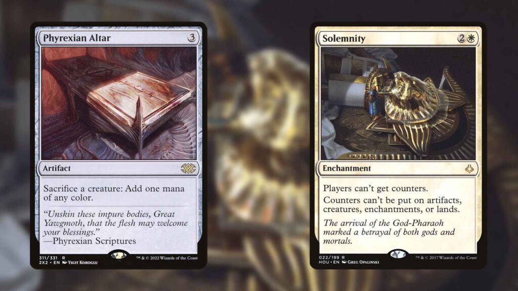 If you don't want to wait multiple turns to amass your Chronozoa army, you can create infinite Chronozoas with Solemnity and Phyrexian Altar. Since Solemnity keeps Chronozoa from ever getting Time Counters, you'll always get token copies whenever you sacrifice it. Not only will this get you an infinitely wide board of illusions, but also infinite colored mana, making winning trivial. For a more direct win, Altar of Dementia can mill an opponent out, while Blasting Station is infinite damage.