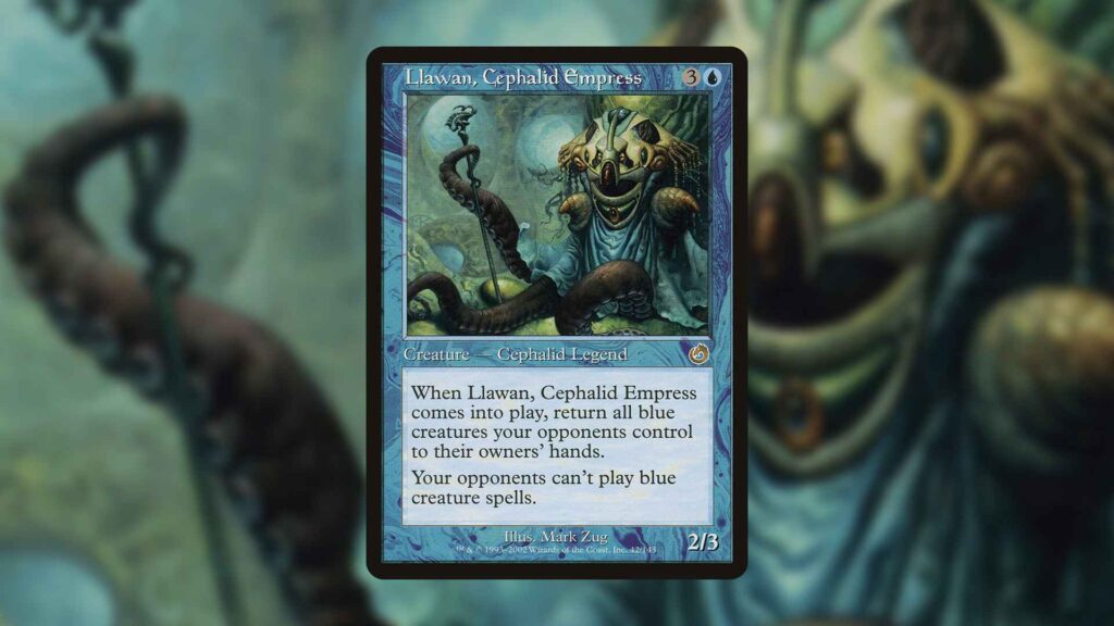 Chances are, if you’ve played Commander long enough, you’ve been annoyed by a blue MTG player at least once. Not only is having all of your crucial spells countered rather frustrating, but some of the most frustrating Game Changers, like Thassa’s Oracle and Rhystic Study, exist in the color. If you ever want to shut your annoying blue friend down completely, Llawan, Cephalid Empress does exactly that.