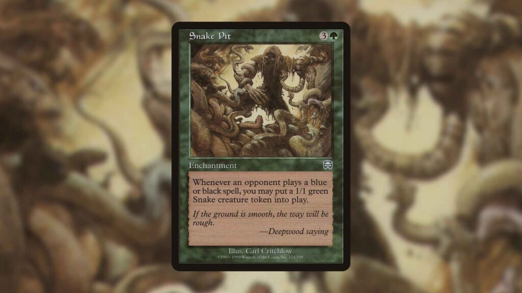 Snake Pit offers a potent effect that casts a wider net on what your opponents are doing. Thanks to targeting both Blue and Black spells, there’s a very good chance that Snake Pit will be generating a healthy amount of creature tokens over the course of a game. All of that said, for some MTG Commander decks, generating a bunch of 1/1s isn’t the most interesting payoff in the world.