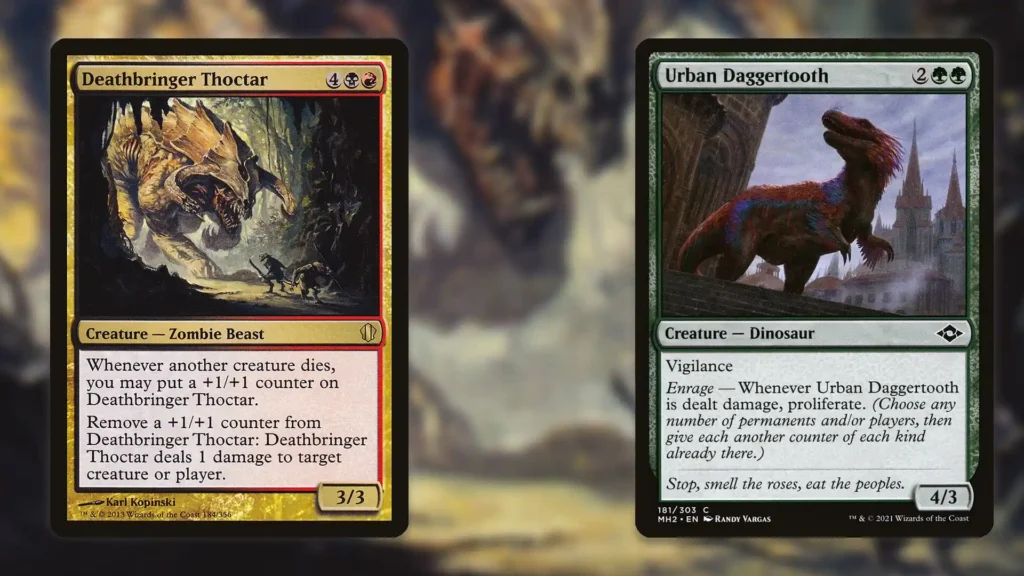 For those who want to take things to the next level, there are a variety of infinite combos you can execute with Deathbringer Thoctor in play. If you control a copy of Urban Daggertooth with a +1/+1 counter on it and Deathbringer Thoctar has at least two +1/+1 counters on it, you can start a chain of infinite Proliferation. Just activate Deathbringer Thoctar’s second ability targeting Urban Daggertooth, and both threats will grow. All your other creatures with +1/+1 counters on them will grow infinitely large in the process. You can even throw in a copy of Hardened Scales to ensure Deathbringer Thoctar grows infinitely large and can then deal infinite damage to each opponent.