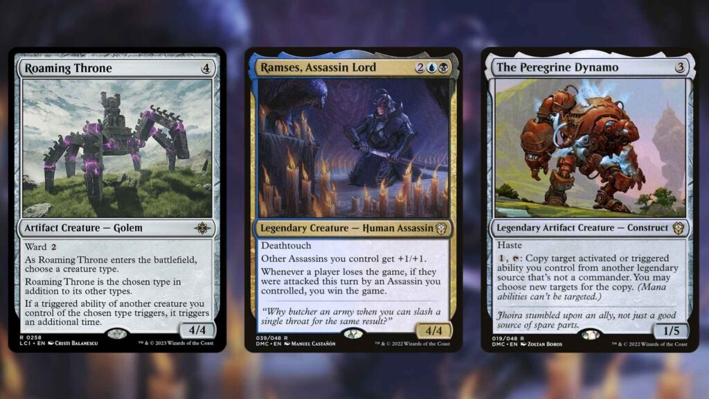 While copying Etrata can end games very quickly, copying Etrata’s trigger can set up instant death combos out of nowhere. Line up two trigger doublers, like Roaming Throne and Strionic Resonator, and you’ll instantly kill an opponent who has three exileable creatures. With all kinds of different copy cards, like The Perigrine Dynamo, Peter Parker’s Camera, and Lithoform Engine to choose from, setting this up is surprisingly easy. Gogo, Master of Mimickery, can even copy Etrata twice on its own, creating a two-card death combo.