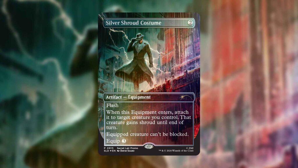 Finally, should you spend $149 or more during the upcoming Secret Lair: Rad Superdrop, you’ll get an additional Silver Shroud Costume promo with your order. This is yet another reprint from the original MTG Fallout set, and it’s a pretty expensive one. Offering removal protection at instant speed, Silver Shroud Costume repurposes itself as unblockable equipment after entry, making it a great upgrade for Commanders who want to push damage. Offering a secondary market value of $13 for its nonfoil variant and $33.50 for its foil one, this is one of the best Secret Lair sales promos we’ve ever seen.