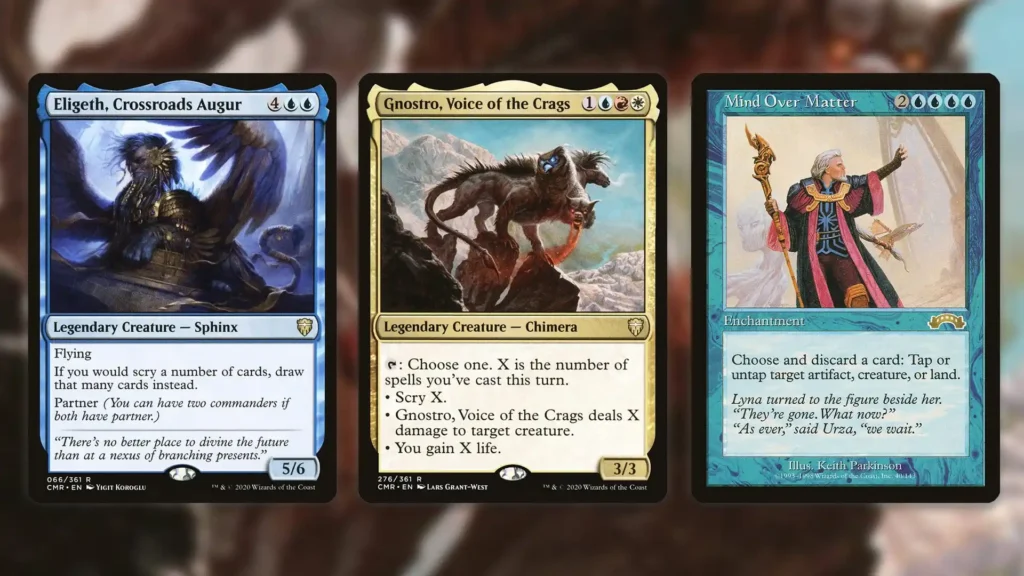 Thanks to Eligeth, Crossroads Augur, going infinite with Gnostro, Voice of the Crags is surprisingly easy. By turning Scry effects into card draw, all you need is Gnostro and Mind Over Matter to pop off. Technically, all you need on top of this is to cast a single spell, but this combo gets better the higher X is.