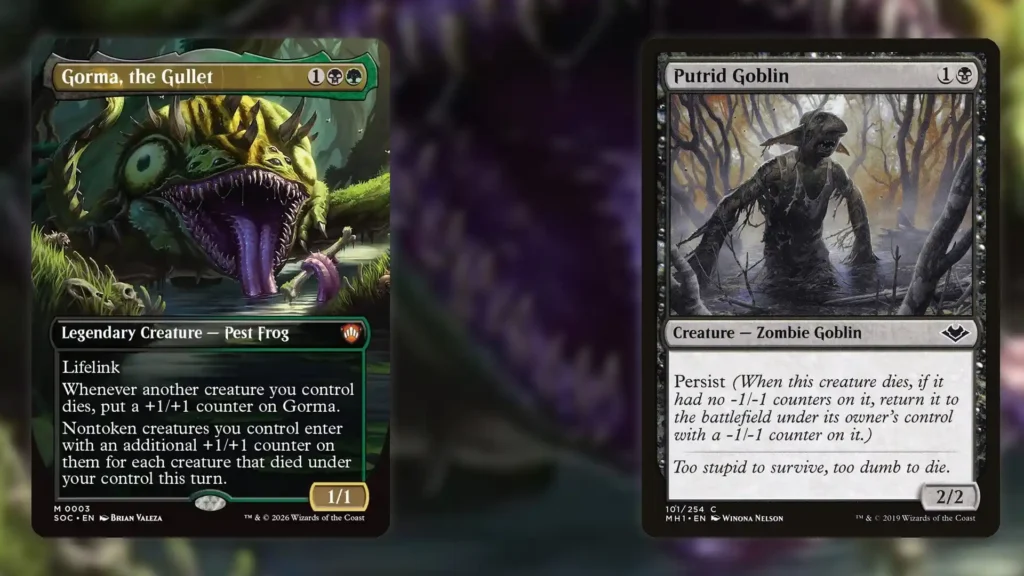 Interestingly, as strong as Gorma is as a Sacrifice and Counters-themed hybrid Commander, it becomes even more powerful as a Combo Commander. Thanks to creatures entering play with a +1/+1 counter, Gorma can easily break the Persist mechanic. This creates all kinds of loops, using cards like Putrid Goblin, a free sacrifice outlet, and Gorma.
