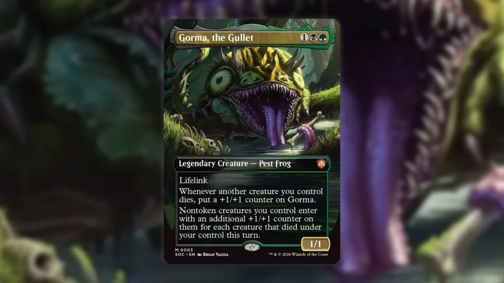 In all this action, a promising Commander from the Witherbloom Pestilence Precon may have been overlooked a bit. Dubbed Gorma, the Gullet, this Frog Pest perfectly blends Sacrifice and +1/+1 counter themes together. Plus, there’s a variety of game-ending combos that can be pulled off quite early in the game with Gorma in the command zone.