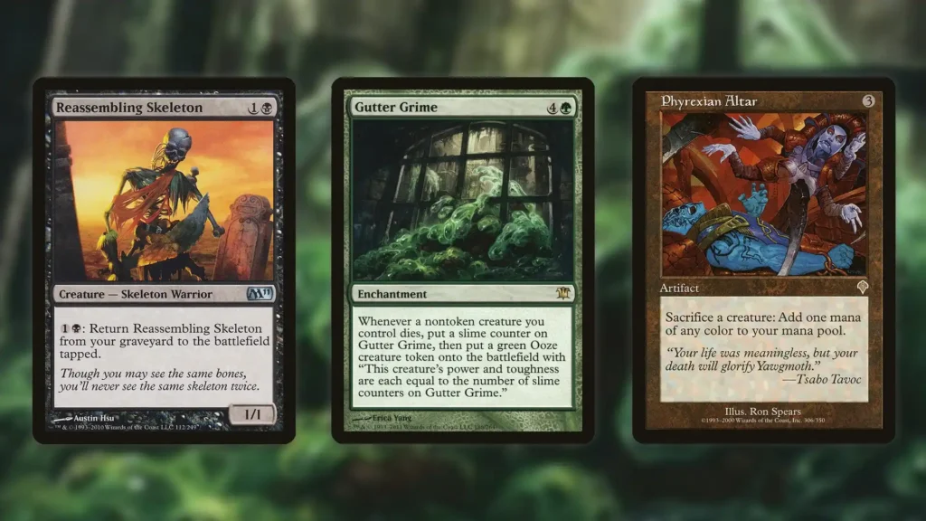 If Gutter Grime’s general synergies weren’t enough to sell you on the card, there are also a variety of token-themed combos that can be executed with the enchantment in play. One of the simplest combos uses Reassembling Skeleton and Phyrexian Altar to make an infinitely big Ooze.