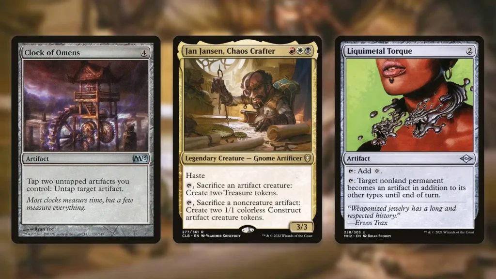 Beyond all of the general synergies Jan Jansen creates, there are also a bunch of infinite combos to pull off. The simplest of these involves Clock of Omens and Liquimetal Torque, resulting in infinite Treasures and Constructs. Once everything is in play, Liquimetal Torque can make Jan Jansen into an artifact, allowing Clock of Omens to untap it. Since both of Jan Janson’s abilities create two artifacts, Clock of Omens can use them to untap your Commander, making infinite tokens. Jan Jansen, Thornbite Staff, and Goblin Bombardment can be used to a similar effect, sacrificing your Construct tokens and dealing infinite damage.
