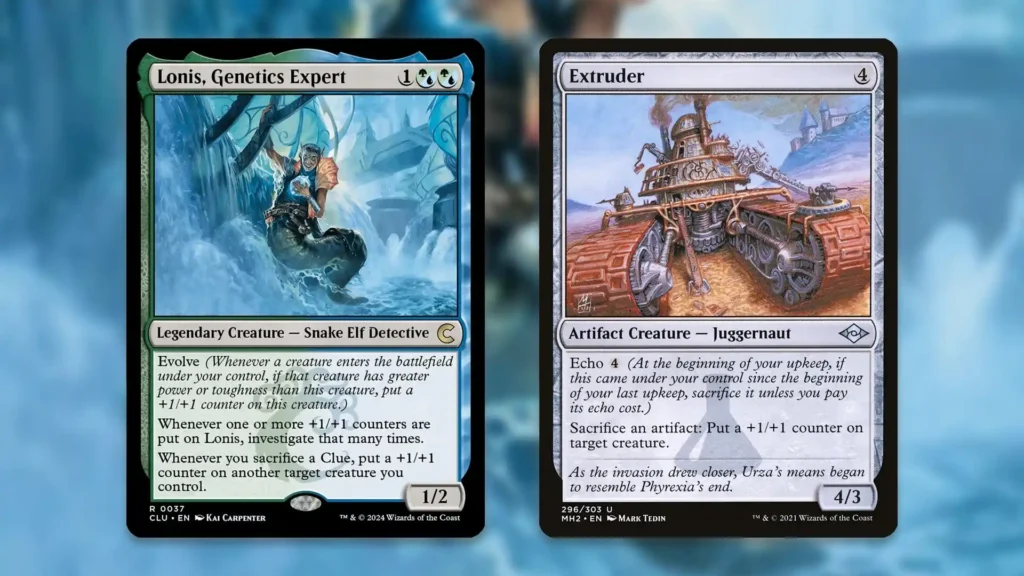 Lonis, and Extruder can easily go infinite together, so long as you have a spare artifact to sacrifice. In doing so, you’re able to put a +1/+1 counter on Lonis, triggering its middle ability to make a Clue. Of course, Extruder can sacrifice this again, growing Lonis further. All the while, Lonis’s last triggered ability also allows you to buff your other creatures. By repeating this process as many times as you wish, your whole squad will grow infinitely large.