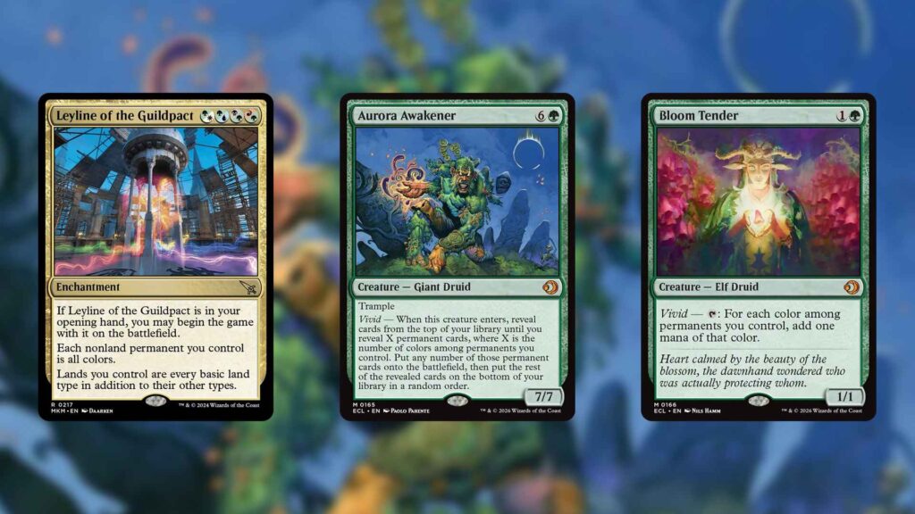 Meanwhile, in Standard, Aurora Awakener creates a blisteringly fast combo, allowing the giant to prey on other uninteractive Badgermole Cub decks. By starting the game with Leyline of the Guildpact, you solve the colored permanent issue, allowing Aurora Awakener to put five permanents into play. This also allows Bloom Tender to tap for all five colors, giving you a quick way to ramp out Aurora Awakener on turn three.