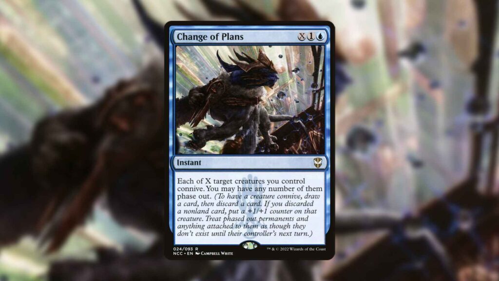 Change of Plans offers a lot of things in one card, making it play better than it may look at first glance. Phasing things out is certainly the core payoff here, saving your creatures from targeted removal and board wipes. The Conniving is certainly an underrated perk, too, both buffing your creatures and offering card selection. If you can partner this with something like Teferi’s Ageless Insight, Change of Plans can even provide raw card advantage.