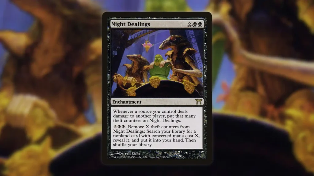 Well, if tutoring for one card wasn’t enough, there’s an enchantment from Champions of Kamigawa that can repeatedly search for cards turn after turn. On top of that, it also enables a two-card combo with itself! The card’s name is Night Dealings, and while it takes some work to maximize the enchantment, the payoff is certainly there.