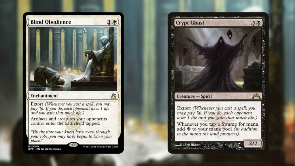 In total, only 16 cards offer the option to Extort your spells. The good news is that, among these, there are some extremely powerful Commander super staples to consider. Blind Obedience, for example, excels at slowing down fast mana, buying you tons of time to set up your game plan while you drain your opponent’s life. Crypt Ghast is undoubtedly the best Extort card for Black decks, doubling the amount of mana your Swamps produce.