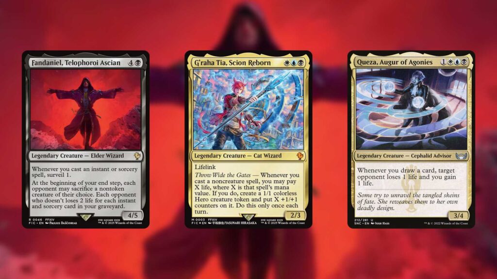 Perhaps the best card to take advantage of this idea is the recently released G’raha Tia, Scion Reborn from Final Fantasy Commander. While you can go the route of casting one big spell to maximize G’raha’s payoff, it’s equally viable to trigger G’raha’s ability on every turn, including your opponent’s. Getting additional tokens when casting small cantrips amplifies the pressure that Extort causes while offsetting your Commander’s downside. Queza, Augur of Agonies can similarly amplify Extort’s potency when partnered with cantrips, in particular.
