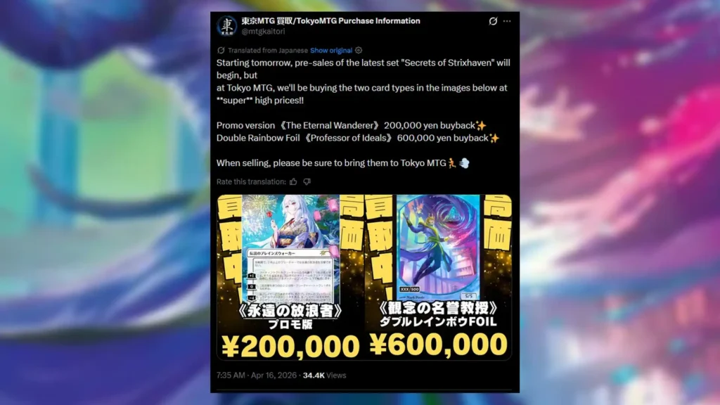 In addition to the headliner card, TokyoMTG also announced a bounty for a Japanese promo variant of The Eternal Wanderer for 200,000 Yen, or $1265.58. Exclusive to Japan, these promos can be found in select Commander protector cases given to those who purchase Play or Collector boosters. With 2,000 copies available, it’s not too surprising that the asking price is high.