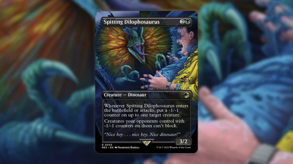 Released as part of The Lost Caverns of Ixalan, Spitting Dilophosaurus is quite an interesting card. Both of this Dinosaur’s abilities work perfectly in tandem with each other. The more creatures you plague with -1/-1 counters, the easier it is to keep attacking and sneak Spitting Dilophosaurus past opposing blockers.