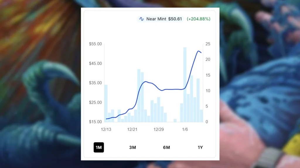Over the past month, Spitting Dilophosaurus has experienced two distinct demand surges. The first major change occurred right before Christmas when the Lorwyn Eclipsed precon face Commanders were leaked. After a small lull, the reveal of the Blight Curse precon decklists and Spitting Dilophosaurus’ omission caused an even bigger demand burst. Now, the market price for this Dinosaur has ballooned all the way to $50.49 at the time of writing, representing a huge jump since its $16.60 price tag a month ago.