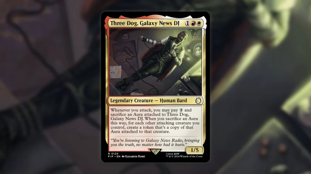 For a three-mana creature, Three Dog, Galaxy News DJ offers quite a unique array of effects. Not only does it pay you off for playing lots of auras, but it also rewards you for going wide. While this does require some setup, Three Dog doesn’t have to attack itself to trigger, so you never have to put it in harm’s way.