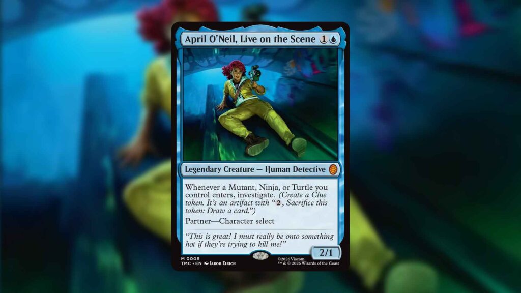 We’ve already seen Heroes in a Half Shell and the other five Partner Commanders that helm the Turtle Power Commander deck, but it appears that a sixth Character Select Partner option is included in the deck. April O-Neil, Live on the Scene offers a second blue Commander for this Partner group to consider.