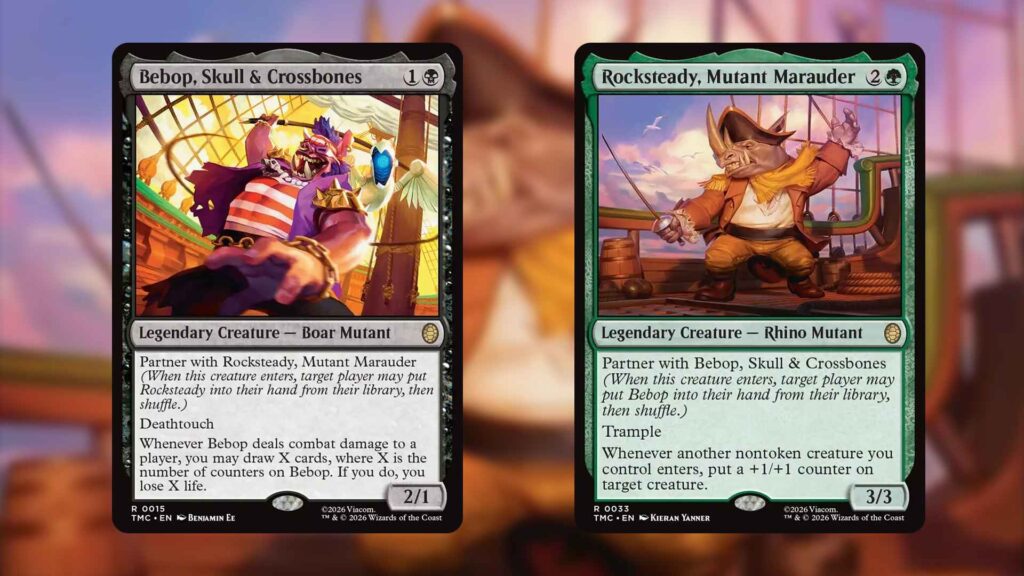 While they don’t work as Commanders for Turtle Power, Bebop, Skull & Crossbones and Rocksteady, Mutant Marauder are an interesting Partner duo to build around. Effectively aiming to make Bebop a massive body to refill your hand, these Commanders offer an interesting approach to the Voltron/ +1/+1 counter strategy. Notably, since they partner with each other by name, these cards could make for an interesting addition to any Golgari +1/+1 counter deck, since they can search oneanother up.