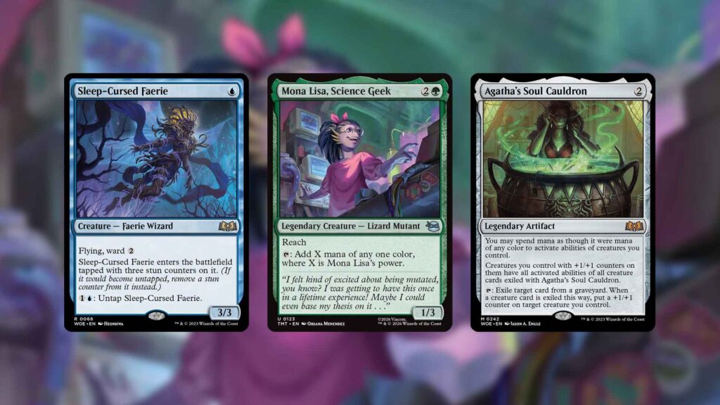 Replacing Kami of Whispered Hopes from March of the Machine, Mona Lisa, Science Geek can make infinite mana when combined with Sleep-Cursed Faerie and Agatha’s Soul Cauldron. With one of the two cards under the Cauldron, and three power on the other creature of your choice, assuming that there are no Stun Counters on your Faerie, you can tap for three mana with Mona Lisa’s ability, and use two of those mana to untap your creature with Sleep-Cursed Faerie. You’ll be netting one mana each time, allowing you to win in any number of different ways.