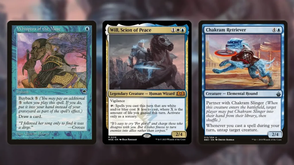 In addition to helping you cast a flurry of expensive spells, Will’s discount also enables a multitude of infinite combos. Whispers of the Muse is already a natural fit in Will decks, and when combined with Chakram Retriever and any mana dork that taps for blue, you can draw your entire deck. Interestingly, you can execute other combos with different Buyback cards, too. Replacing Whispers of the Muse with Recruit the Worthy and a white mana dork, for example, can make infinite tokens instead.