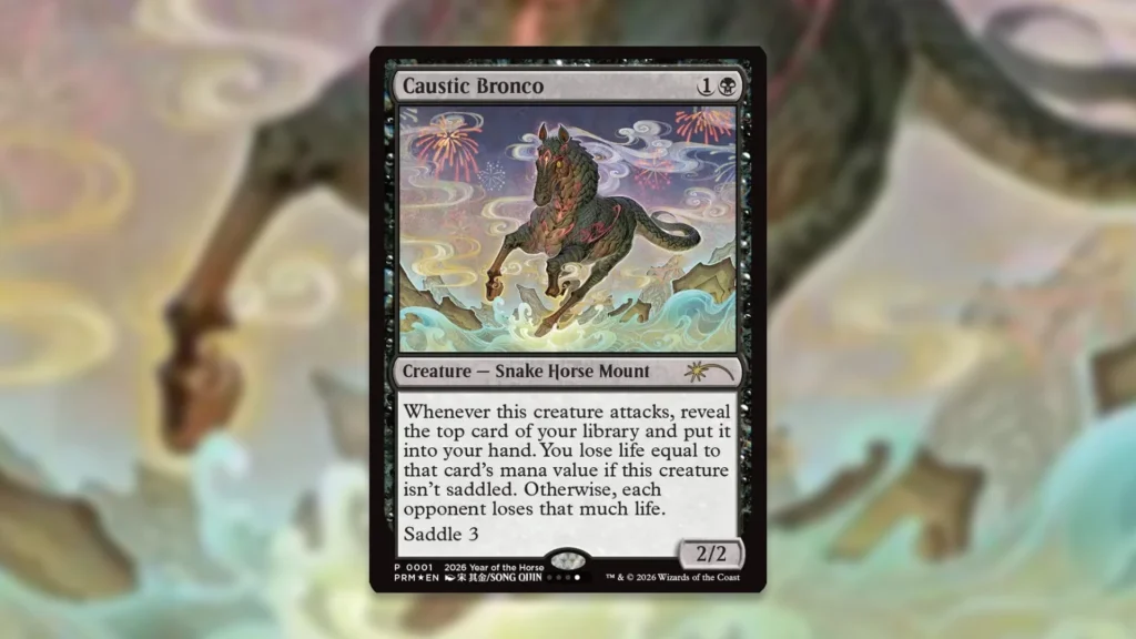 For those interested in acquiring these promos, players in specific parts of Asia and Australia, will have a chance to obtain the Caustic Bronco and Treasure Token at their LGSs starting February 17th to March 15th. From there, throughout 2026, players will have additional opportunities to pick up promos at various CommandFests, Regional Championships, Spotlight Series events, and beyond.
