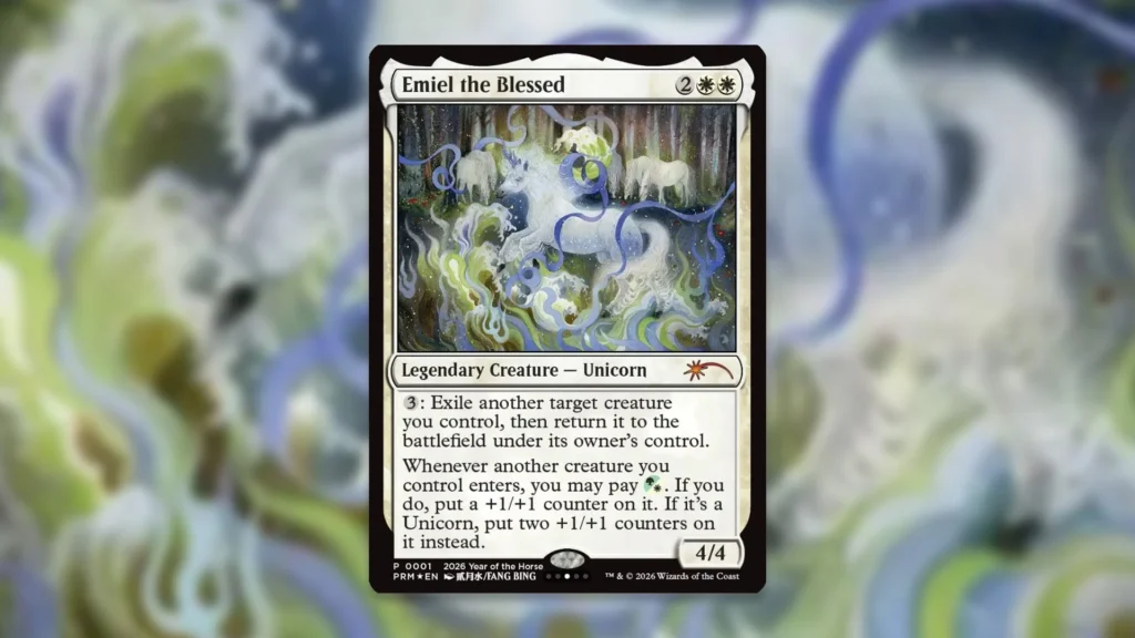 Interestingly, the most exciting promo isn’t actually a Horse creature in the Magic universe, but is instead a Unicorn. Emiel, the Blessed debuted in the first Jumpstart product and has since become a household name. Unlike most blink effects, Emiel’s first activated ability returns the creature to play right away, not at the next end step. This enables you to get a ton of mileage out the ability in one turn, so long as you have a creature with a strong enters ability like Karmic Guide or Thragtusk to abuse.