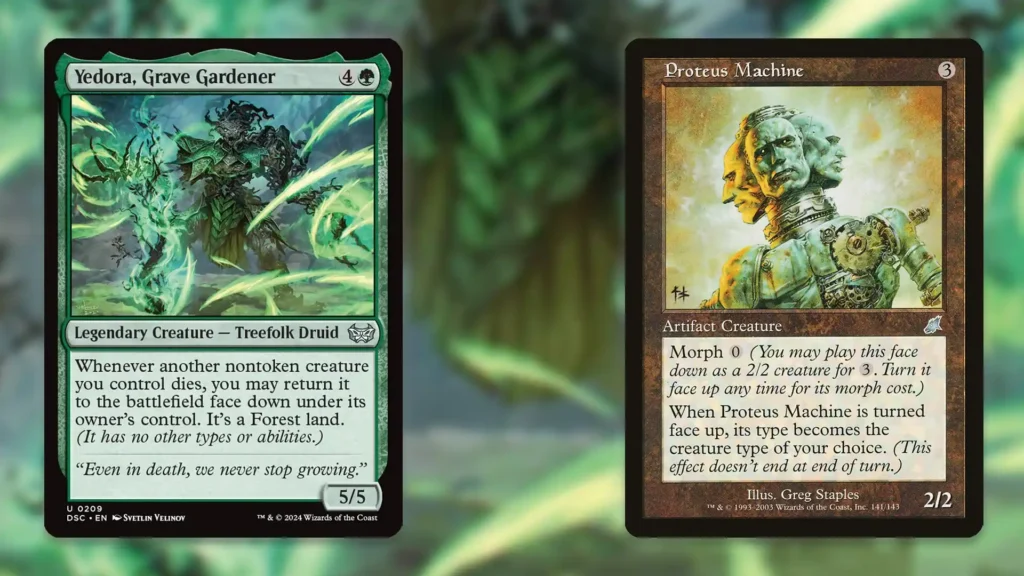 Beyond being a value-generating machine, Yedora also opens the door for numerous infinite combos with various Morph creatures. Proteus Machine paired with a sacrifice outlet, for example, can generate infinite mana and Landfall triggers. Once Proteus Machine dies with Yedora in play, it’ll come back to the battlefield face-down, allowing you to tap it for green. Then, you can turn it face-up without investing any mana and repeat this process. With mana-producing sacrifice outlets like Ashnod’s Altar, you can execute similar combos with a wider array of Morph creatures.