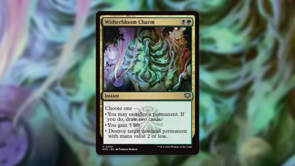 Importantly, Witherbloom Command also fills this role and is quite an underrated new addition to the deck. Besides just answering small creatures, this Instant tags problematic noncreature permanents. Plus, using the first mode in attrition battles or the second mode post-Planeswalker ultimate can be quite strong.