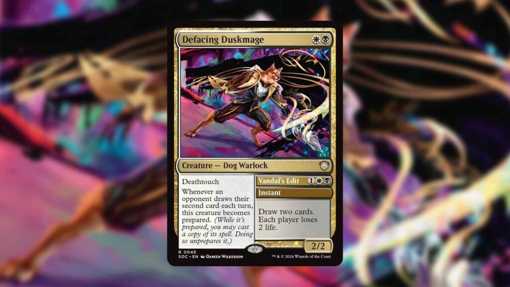 This is already good enough for a lot of Commander decks, but Defacing Duskmage can do even more work when synergized with. Line the Dog Warlock up with Magecraft cards like Professor Onyx, for example, and this pup can create an absurd amount of value. Common mana reducers, like Pearl and Jet Medallion, also make Vandal’s Edict cheaper while speeding up the rest of your deck.