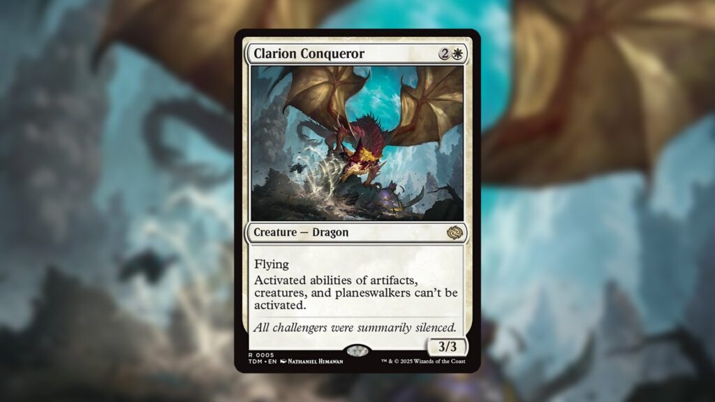 Up to this point, Clarion Conqueror has mostly appeared in Modern sideboards. Specifically capable of stopping Basking Broodscale Combo, Clarion Conqueror can prevent Eldrazi Scion tokens from sacrificing themselves for mana. The card also stops Blade of the Bloodchief from equipping itself to anything, and Karn, the Great Creator from activating its abilities.